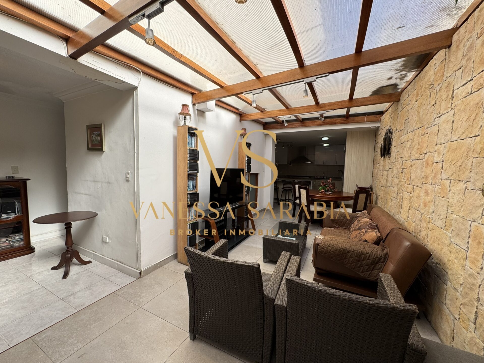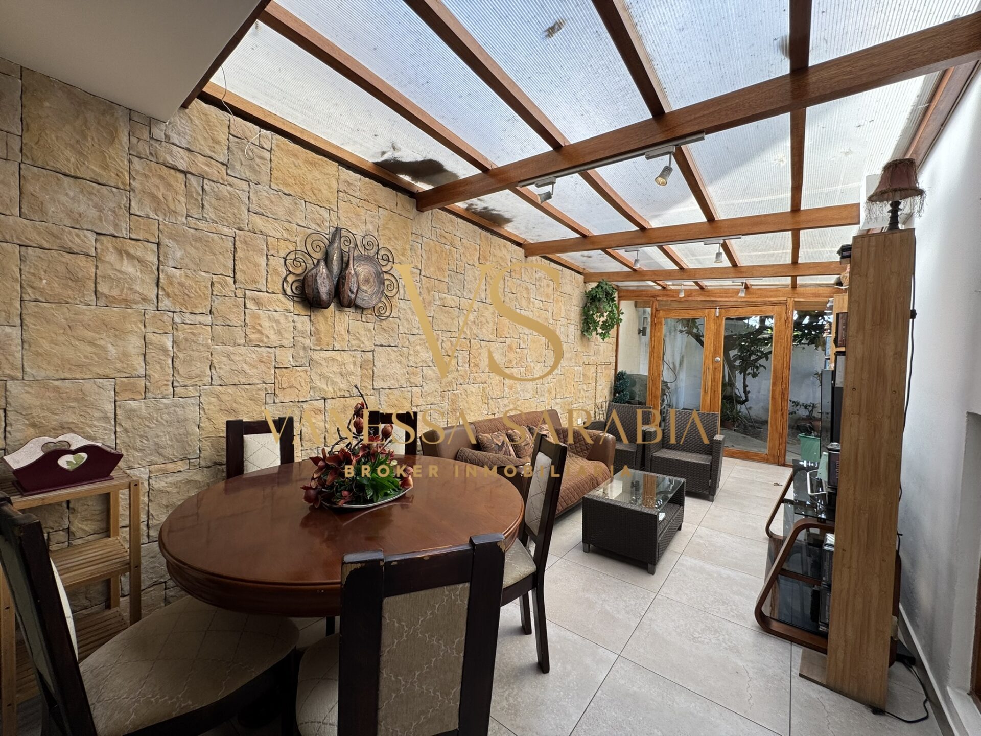 Sala de estar bajo pérgola con salida al jardín
